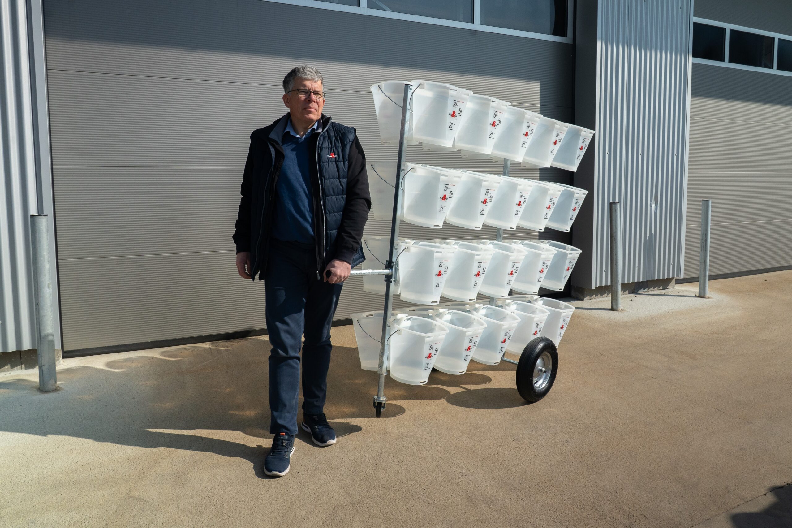 - Bastidor de transporte móvil para hasta 40 cubos con tetina (sin cubos), con asa y dos neumáticos