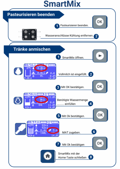 SOP:en vägleder användaren genom de olika stegen så att komponenterna fylls på i rätt ordning och MjölkTaxi kan registrera mängderna helmjölk och vatten på rätt sätt. Eftersom en jämn torrsubstanshalt är särskilt viktig beräknar SmartMix valoriseringen av helmjölken (här: 11 % TS som fastställts för helmjölk) och den exakta sammansättningen av komponenterna till den önskade torrsubstanshalten på 14 %.