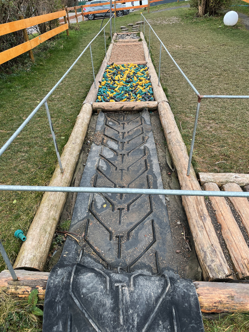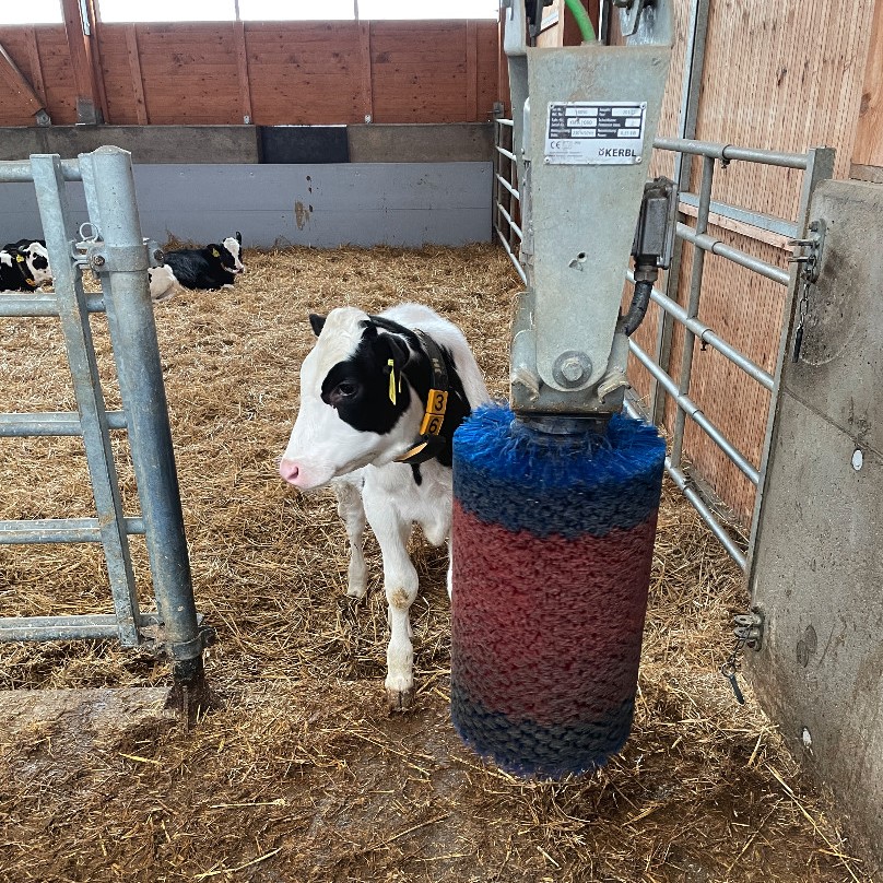 In de hokken zijn roterende kalverborstels en grote ballen aangebracht. Daar houden de kalveren van en ze spelen intensief met beide elementen. Dit is alweer een blijk van de gerichtheid op het dierenwelzijn op de Karlshof.