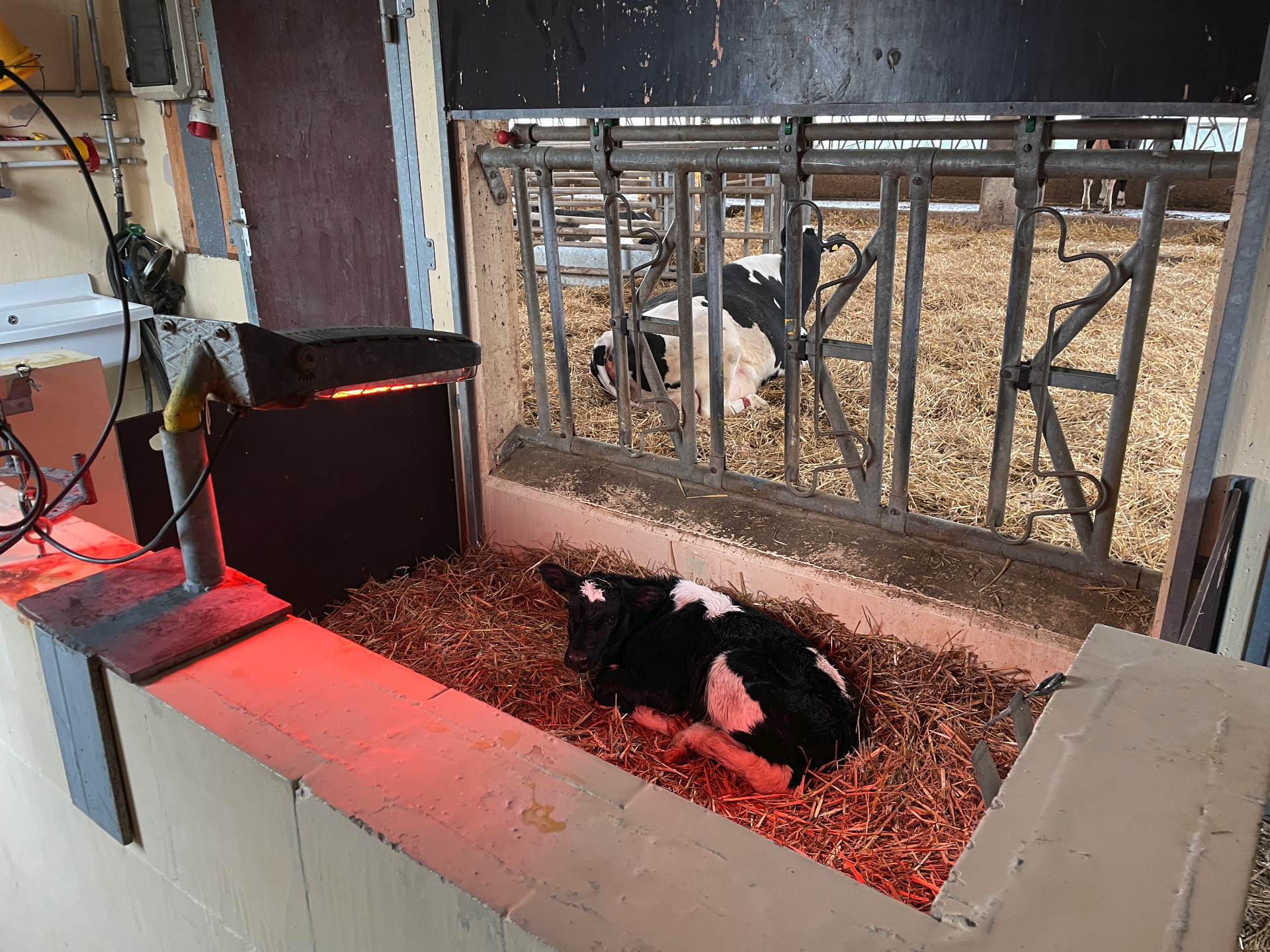 De kalveren komen na de geboorte in een cuddlebox. Dat wil zeggen ze worden uit de afkalfbox verwijderd, maar kunnen via het voerhek altijd nog door de koe worden bereikt. In de speciaal ingerichte ruimte vindt de eerste verzorging van het kalf, waartoe ook het geven van 4 liter biest behoort, plaats.